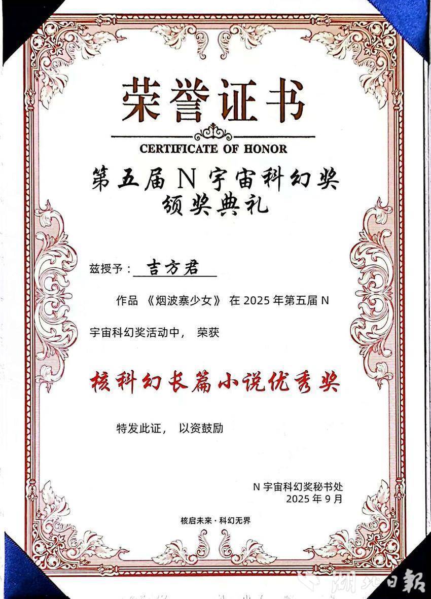 (通讯员 周政、田辉霞、程林芳、高翔)近日,第五届N宇宙核科幻全国小说大赛颁奖典礼在成都科幻馆落幕,蕲春籍作家吉方君(原名高永祥)凭借长篇科幻小说《烟波寨少女》斩获优秀长篇小说奖。