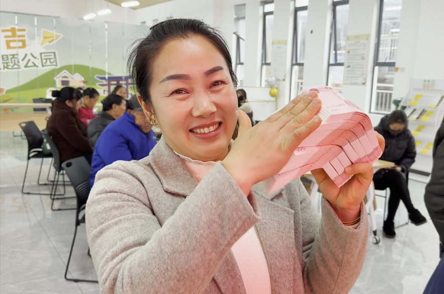 合作社社员领到分红喜笑颜开。
