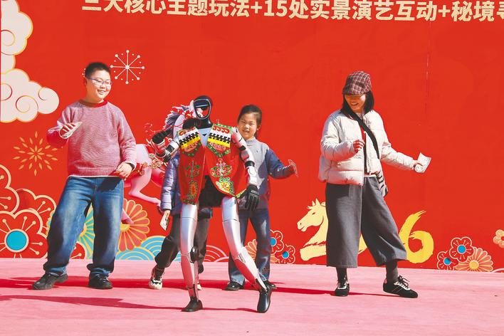 游客与身着民族服饰的机器人斗舞。(受访单位供图)