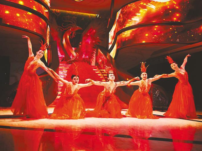 “以前游长江看山水,现在坐‘楚风号’,仿佛穿越回楚国。”来自湖南的游客王女士身着楚服,跟着演员学习揖礼,手中印着楚式漆器纹样的灯笼随风轻摇。沉浸式体验遍布游轮各处,四层空间打造四大独立剧场,以屈原、昭君、李白为叙事锚点,以凤凰为核心图腾,串联“寻凤—问道—归鸣”完整脉络。