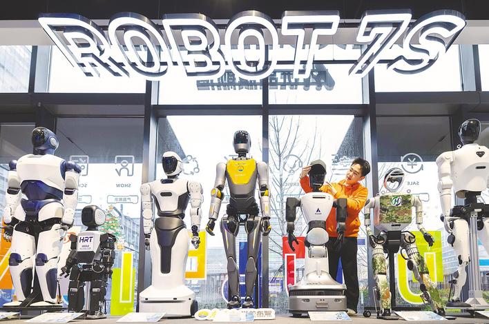 全国首家人形机器人7S店内,工作人员正有序整理陈列人形机器人及各类AI潮品。(湖北日报全媒记者 薛婷 摄)