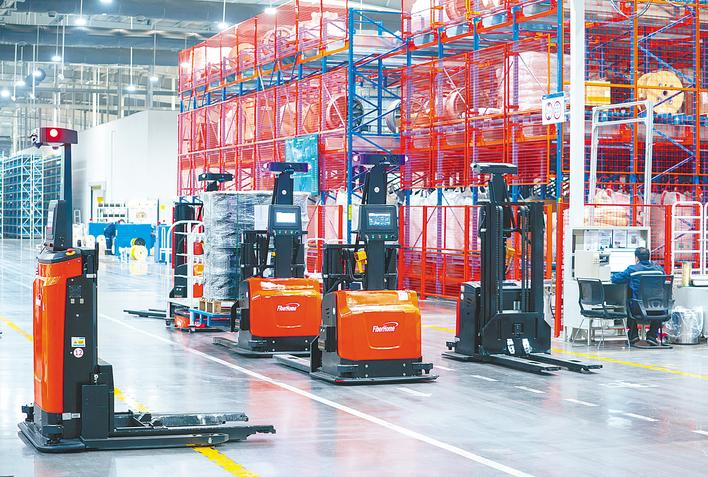 烽火通信5G智能工厂内,各类自动化设备有序运转,精准完成原材料转运与成品输送工作。(湖北日报全媒记者 魏铼 摄)