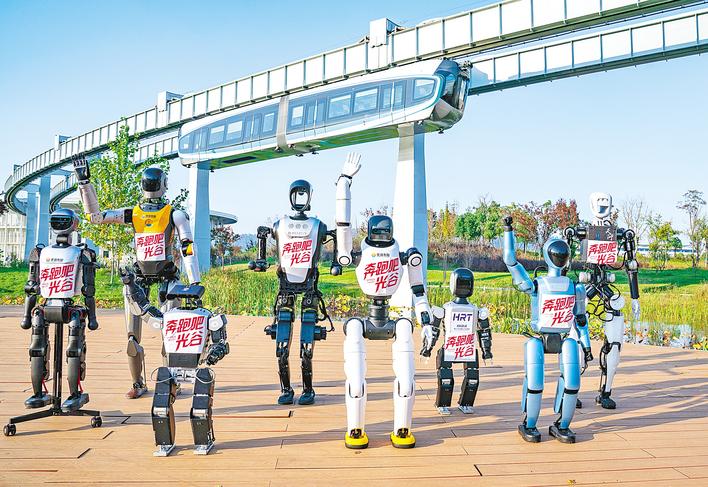 光谷中央生态大走廊,8台来自5家光谷企业和高校的人形机器人齐聚一堂。 (湖北日报全媒记者 魏铼 摄)