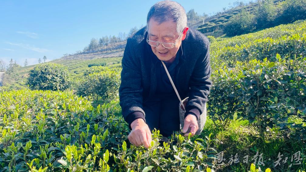 茶农谢正普年过七旬,但采茶依然灵活。  (全媒体记者 杨亚玲 摄)