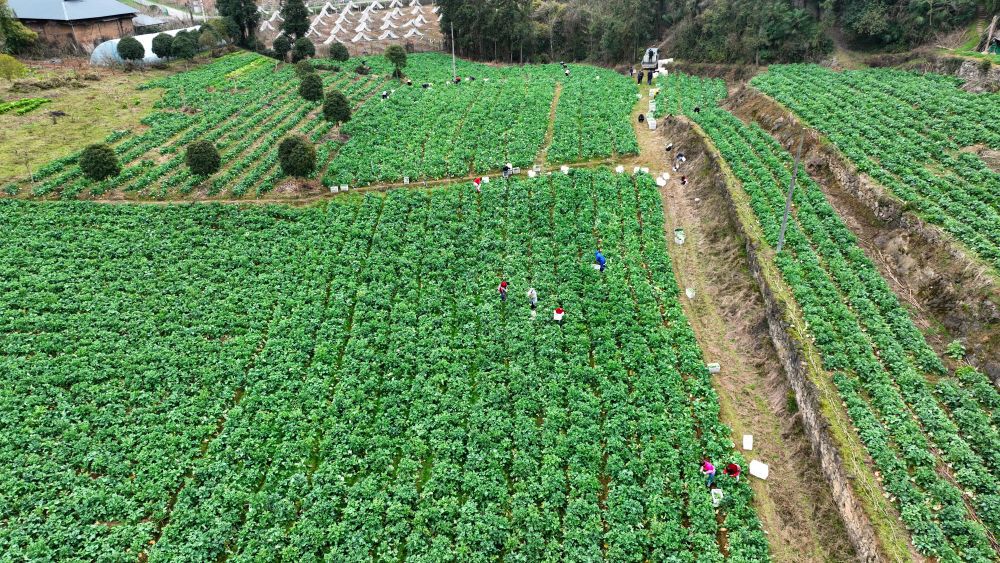 新华社武汉3月15日电(记者田中全、张阳)近日,湖北省恩施州建始县业州镇乐家坝村百余亩板蓝根青菜基地迎来丰收。村民们穿梭在翠绿菜畦中,娴熟地掐下板蓝根青菜,整齐码放进菜筐。经快速分拣、预冷保鲜后,青菜搭乘冷链车直达武汉、上海、深圳等城市商超。