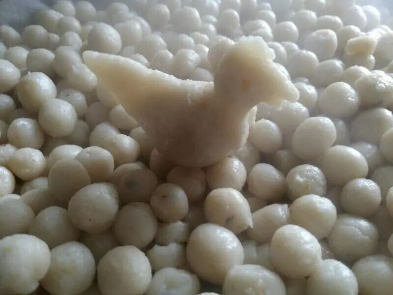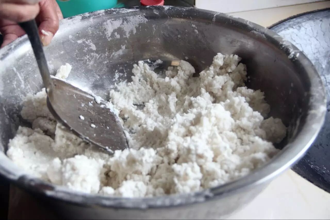 加热水踏成泥,这要多一点耐心,没踏好,做出来的细米圆子就硬心