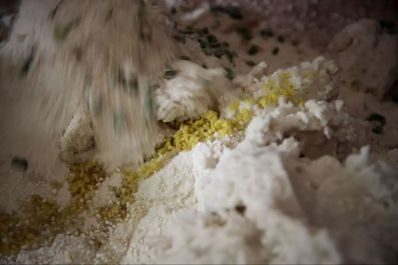 将筛下的细粉、踏细的粉、姜水、葱末融合在一起