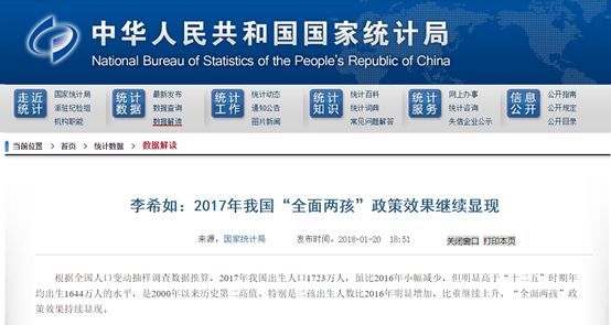 而李希如则表示,2016年和2017年,我国出生人口分别为1786万人和1723万人,比“全面二孩”政策实施前的“十二五”时期年均出生人数分别多出142万人和79万人。出生率分别为12.95‰和12.43‰,与“十二五”时期相比,分别提高了0.84和0.32个千分点。